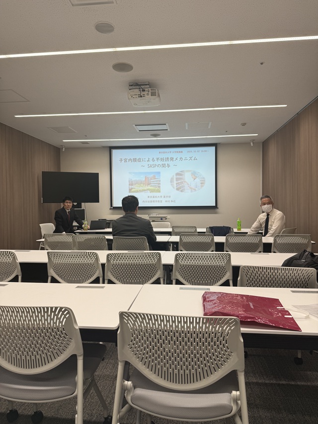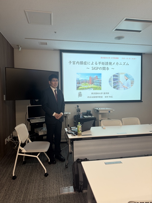 2025年10月2日(木)東京薬科大学 薬学部 内分泌薬理学教室 田村 和広 教授をお招きし、大学院特別講義を開催いたしました。講義では「子宮内膜症による不妊誘発メカニズム:SASPの関与」をテーマにご講演いただき、内膜症のメカニズム、研究知見について大変示唆に富むお話を伺うことができました。田村先生、誠にありがとうございました。
